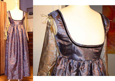 Dank der 3. Staffel Borgia, die ich gerade begonnen habe, und der Tatsache, dass es am Con dieses Wochenende 30° bekommen kann (FREU! =)), hat mich die Tarantel gestochen und ich will/"brauche" ein Sommerkleid für meine Lucrezia. Gestern hab ich aus dem selben Stich heraus mal einfach ein Paar Ärmel genäht nach diesem Vorbild aus einem Reststoff. Heute entstand dann ein neues Kleid aus einem Stoff, den meine Mutter schon für irgendwas gehortet hatte und ich mir vor Jahren unter den Nagel gerissen habe. Das Oberteil ist nach einem Dirndlschnitt modifiziert (damit keine Brustabnäher vorhanden sind!), der ungefütterte Rock gerafft und links auf links angenäht, damit es sich richtig rum so richtig schön bauscht *gg* Seitlich befinden sich rechts unter dem Arm drei große Häkchen zum Schließen und mit etwas Verrenken geht es sogar eigenhändig zu^^ Als Zierde ist nur ein dunkelbraunes Samtband angebracht, da der Stoff (Seidengemisch scheinbar) schon so prächtig ist.